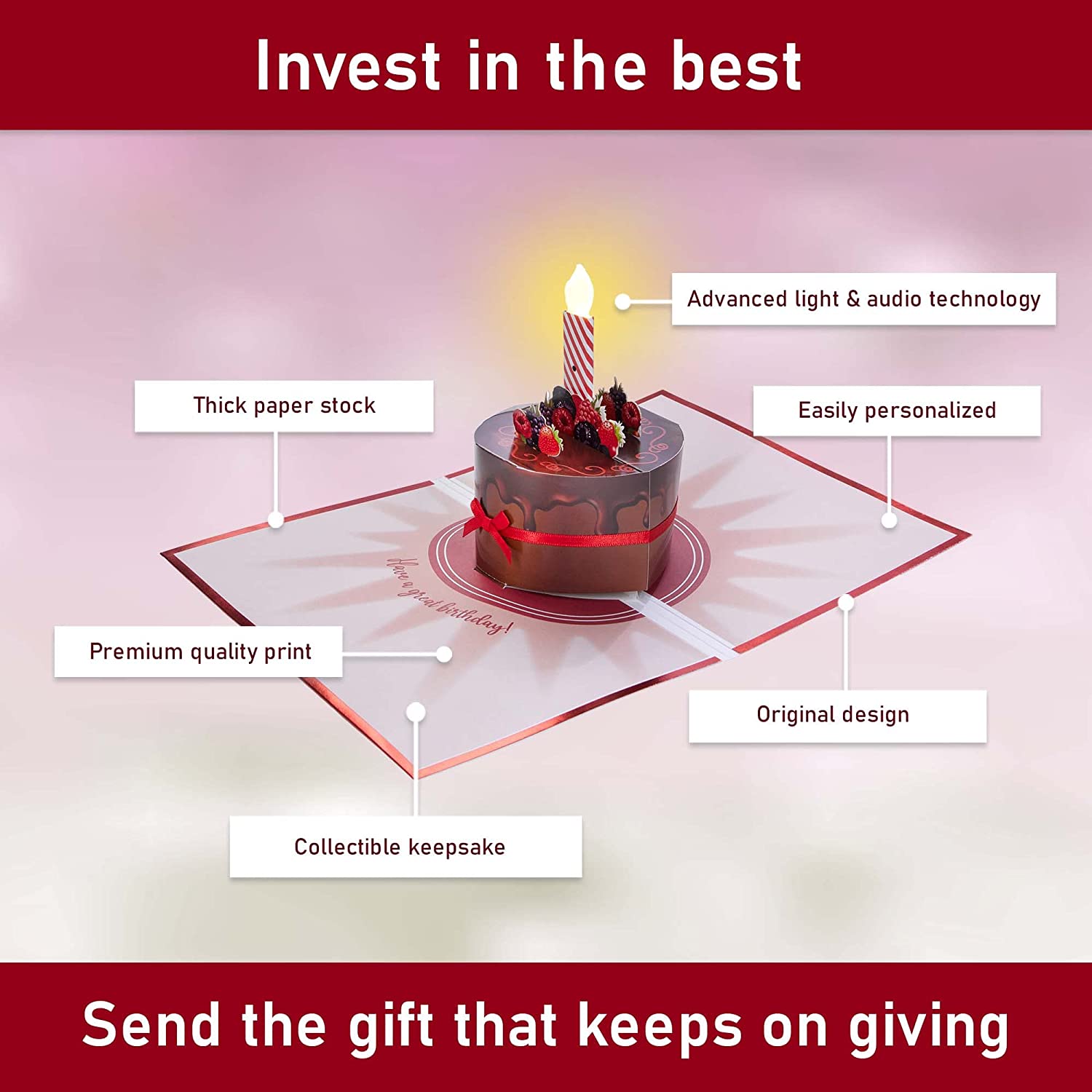 There’s no better way to wish your loved one a happy birthday than with our beautiful 3D chocolate cake pop-up card! They’ll be all smiles when they open this card, greeted by the classic Rock & Roll song “Birthday.” Plus, the whole card design is completed with a special light-up candle!