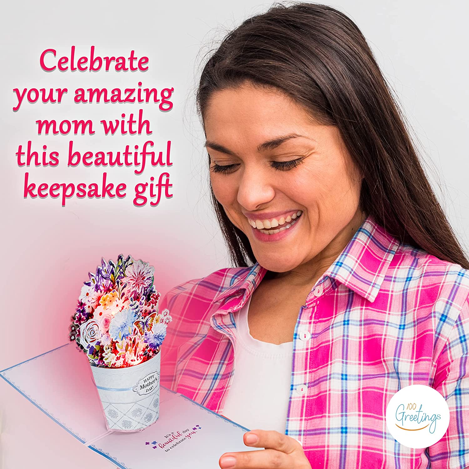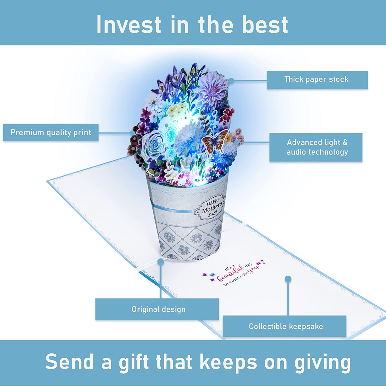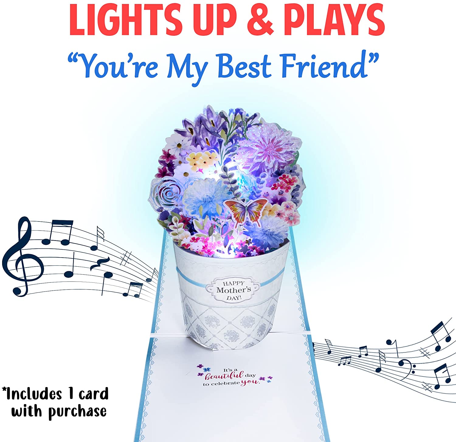 Our stunning Bucket of Flowers Mother's Day pop up card lets you send your mom a heart-warming Mother’s Day greeting with lights & music! Imagine the warm fuzzy smile on her face when the card pops up with a beautiful flower scene and plays the song ‘You’re My Best Friend'.
