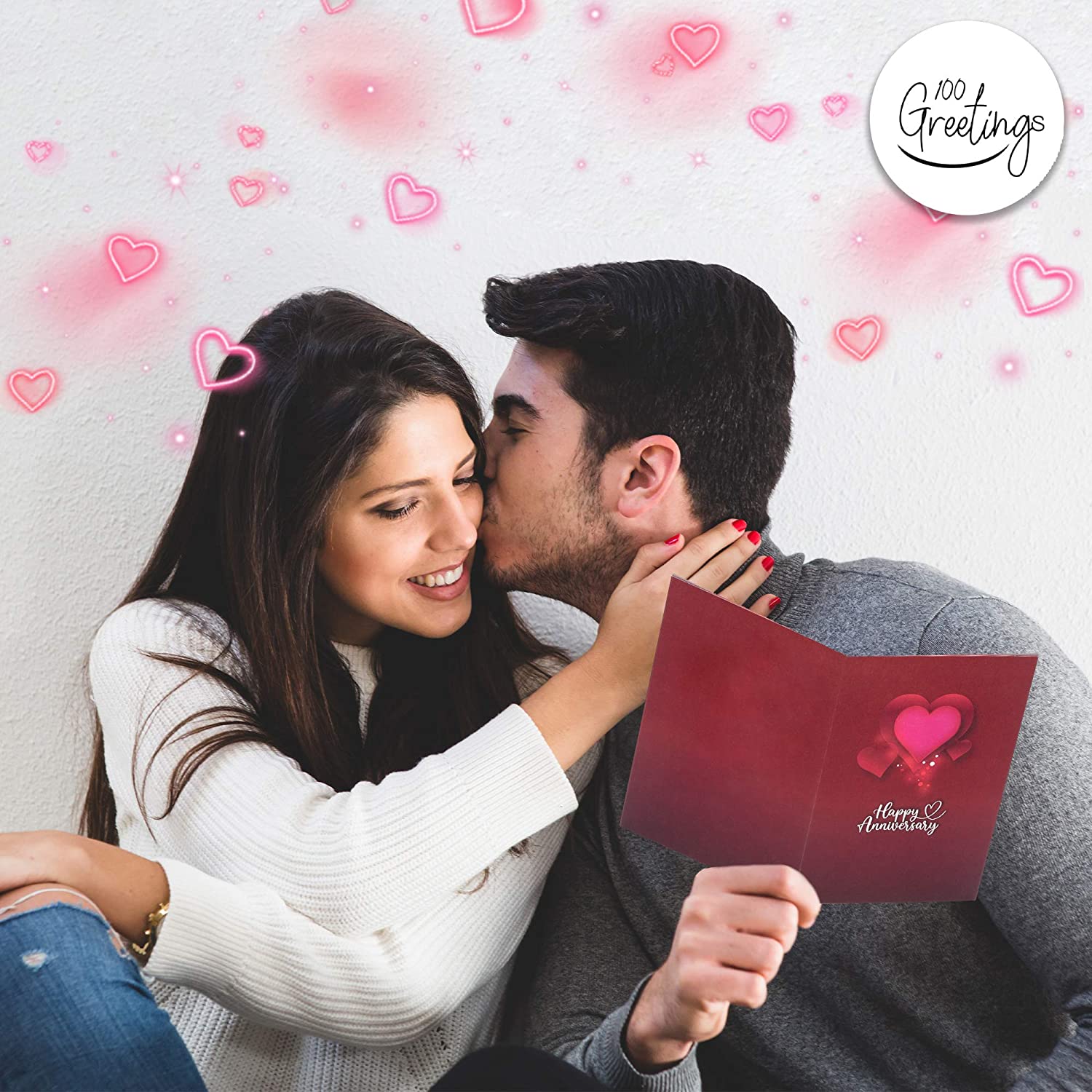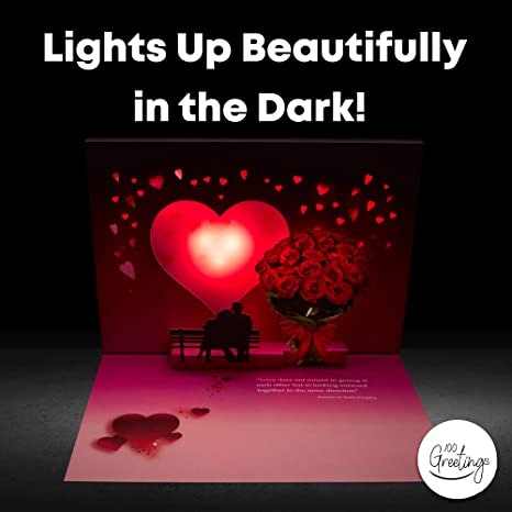 This 3D Anniversary Day greeting card pops up and plays the famous song 'Just the Two of Us,’ displaying a bouquet of red roses and a romantic heart sunset scene that lights up and glows in time with the music.