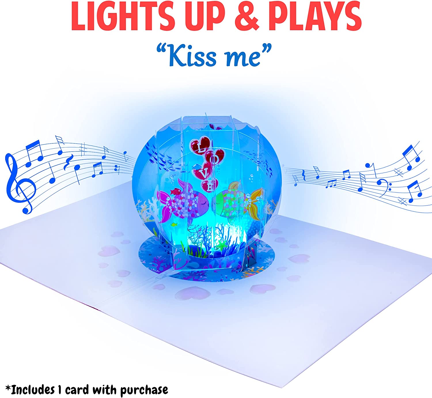 Our super cute Kissing Fish pop-up card lets you send your special someone a truly romantic anniversary greeting with lights & music! Imagine the warm fuzzy smile on their face when your card pops up with a beautiful Kissing Fish in a bowl scene, and it lights up and plays the hit song ‘Kiss Me'. (Each purchase includes ONE of our pop up anniversary cards)