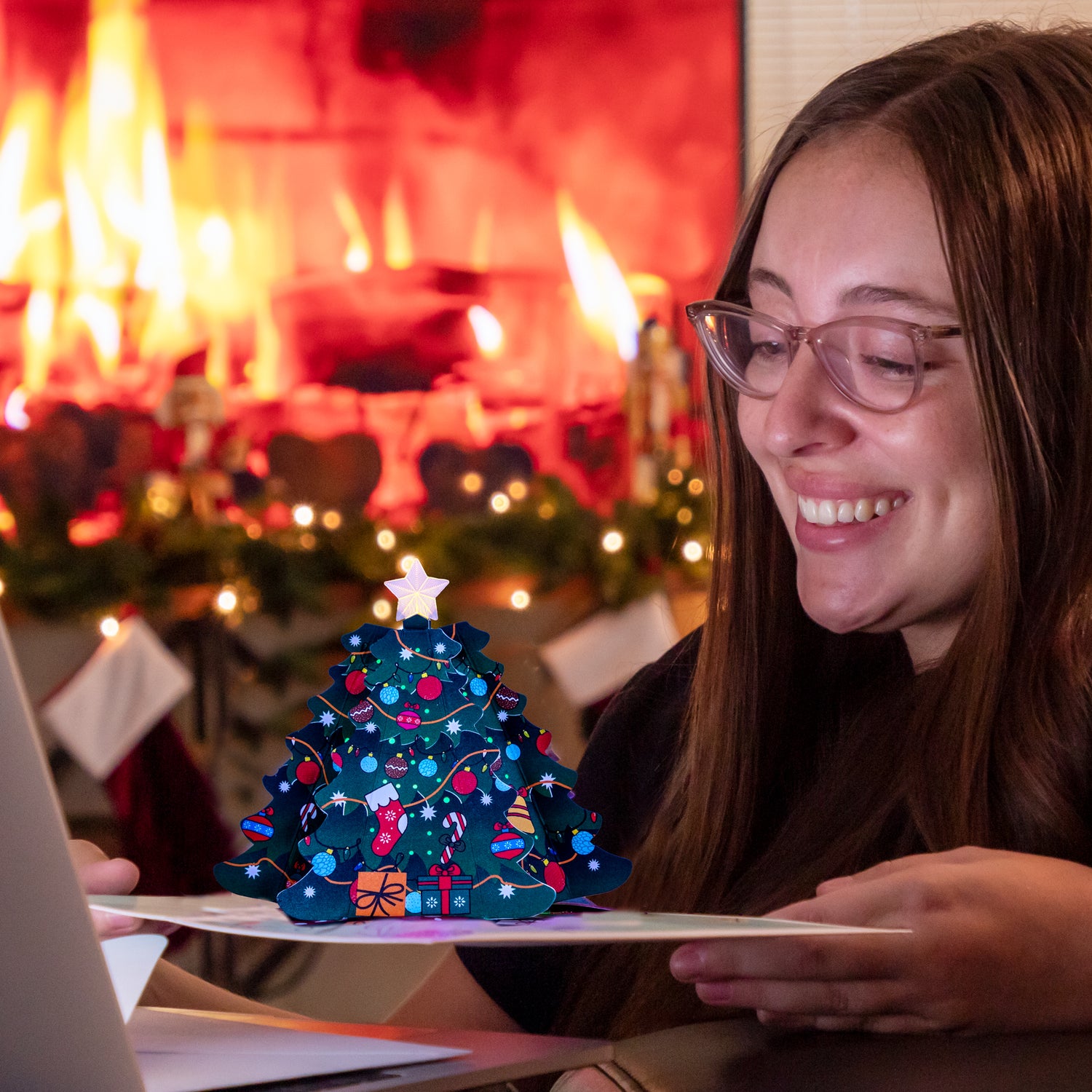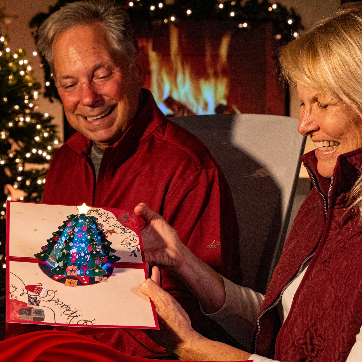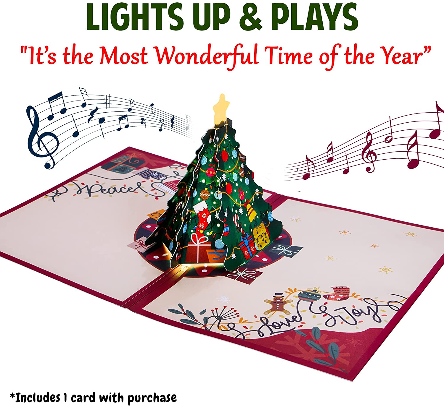 Our stunning Christmas popup cards let you gift the joy of Christmas to your loved ones with festive lights & music. Imagine the smile on their face when they open your colorful Christmas Tree card and it pops up to play “It's the Most Wonderful Time of the Year” as the lights dance in sync! - (Each purchase includes ONE of our magical Musical Christmas Cards)