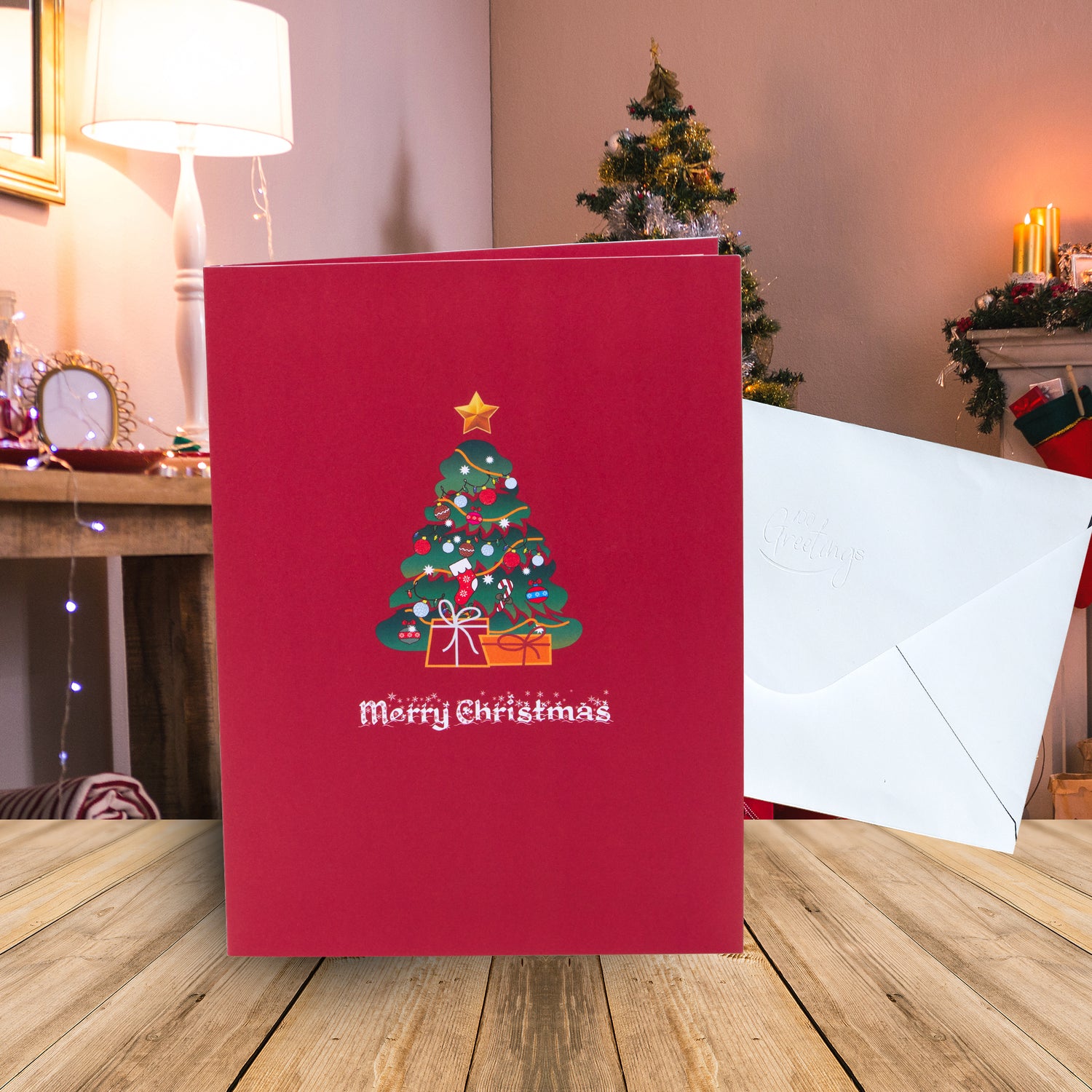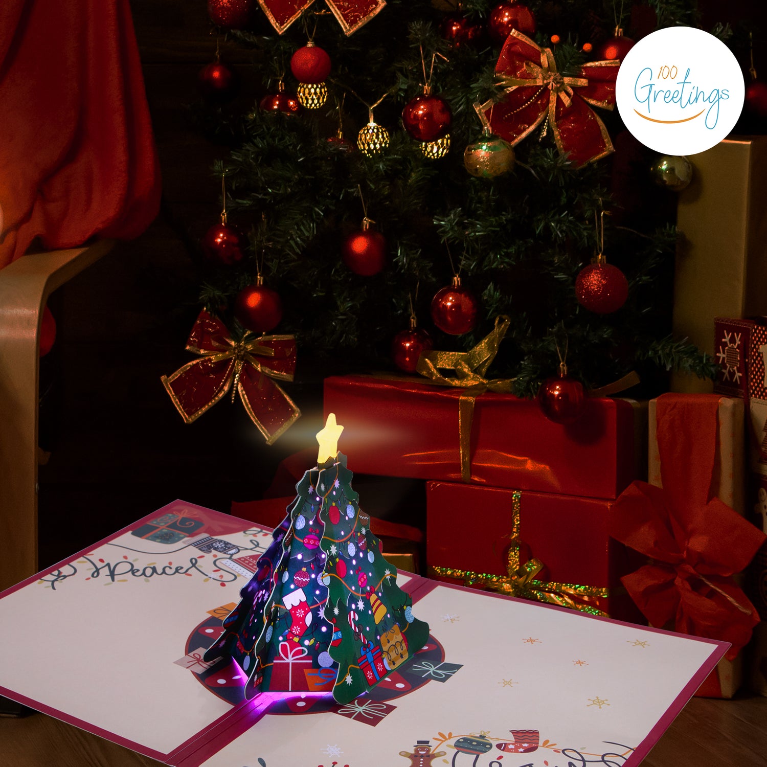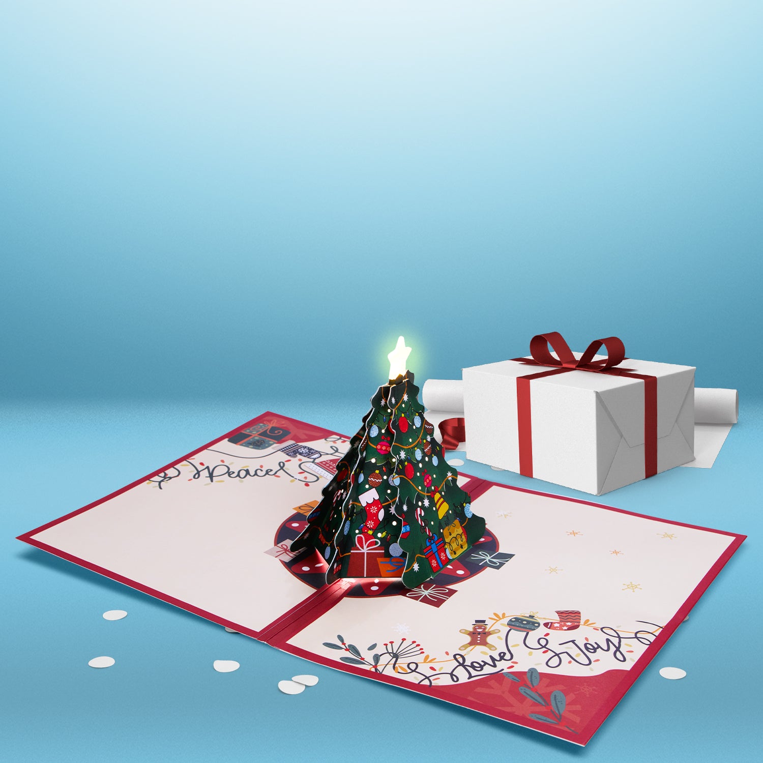 Our stunning Christmas popup cards let you gift the joy of Christmas to your loved ones with festive lights & music. Imagine the smile on their face when they open your colorful Christmas Tree card and it pops up to play “It's the Most Wonderful Time of the Year” as the lights dance in sync! - (Each purchase includes ONE of our magical Musical Christmas Cards)
