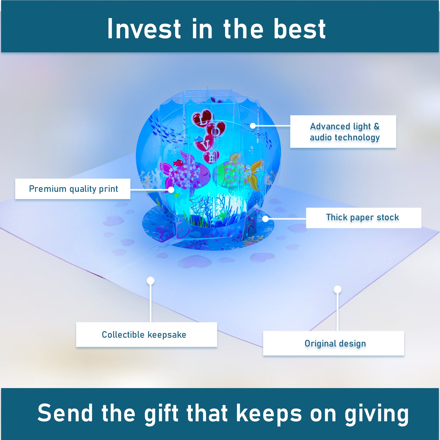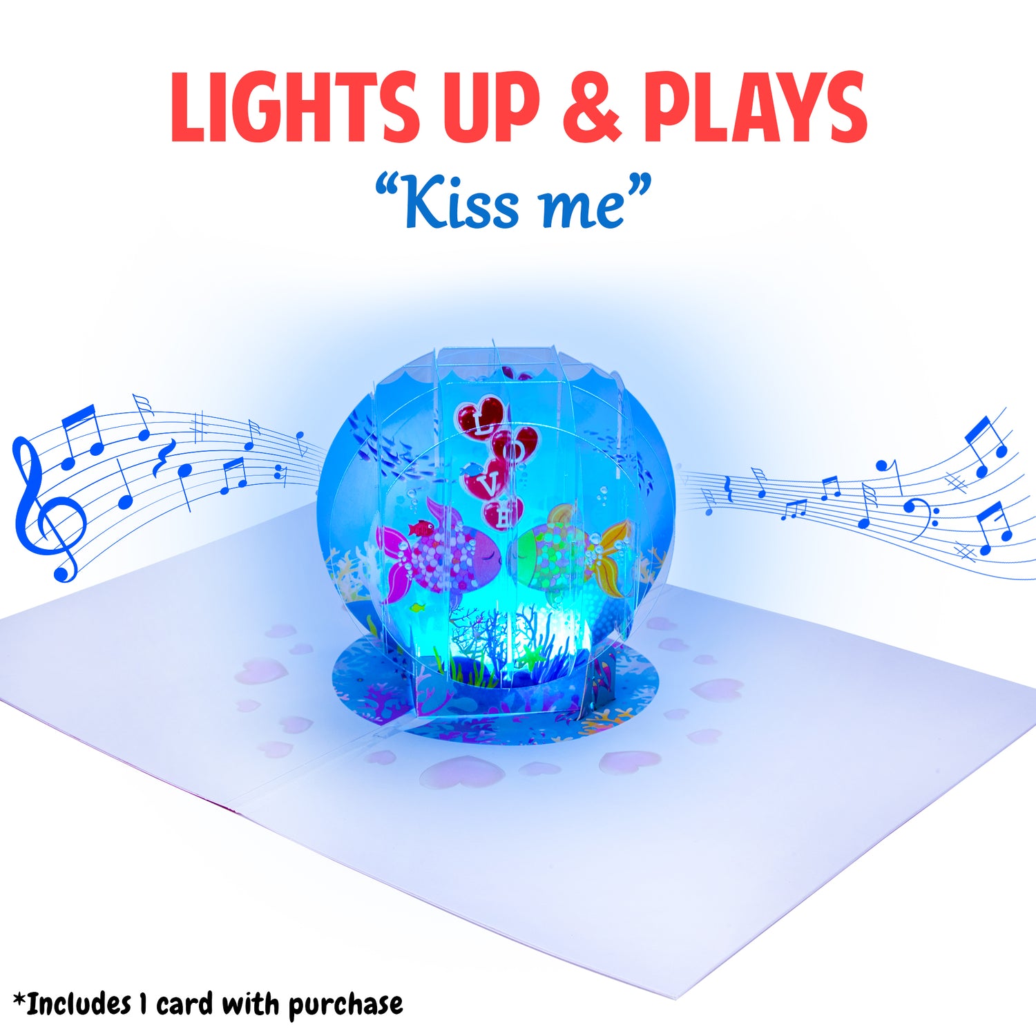 Our super cute Kissing Fish pop-up card lets you send your special someone a truly romantic anniversary greeting with lights & music! Imagine the warm fuzzy smile on their face when your card pops up with a beautiful Kissing Fish in a bowl scene, and it lights up and plays the hit song ‘Kiss Me'. (Each purchase includes ONE of our pop up anniversary cards)